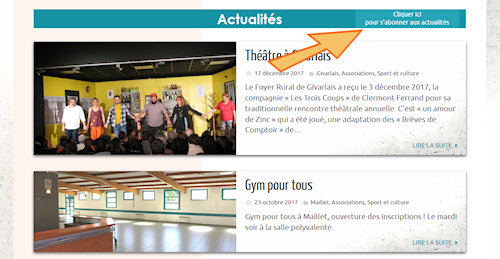 En page d’accueil, les Actualités vous permettent de suivre les petits et grands événements de la commune. Un bouton est proposé dans la barre d’actualités, afin de vous abonner au site