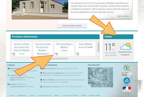 En bas de toutes les pages du site, vous trouverez des informations utiles, dont un accès à la carte et aux coordonnées des mairies. Il y a aussi un bouton Météo, et un espace qui vous propose les prochains Événements attendus sur la commune. Associations, n’hésitez pas à communiquer ainsi auprès des habitants !