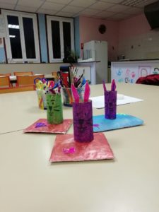 Ses oreilles ornent ces colorés et pailletés pots pour recevoir les œufs en chocolat !!!