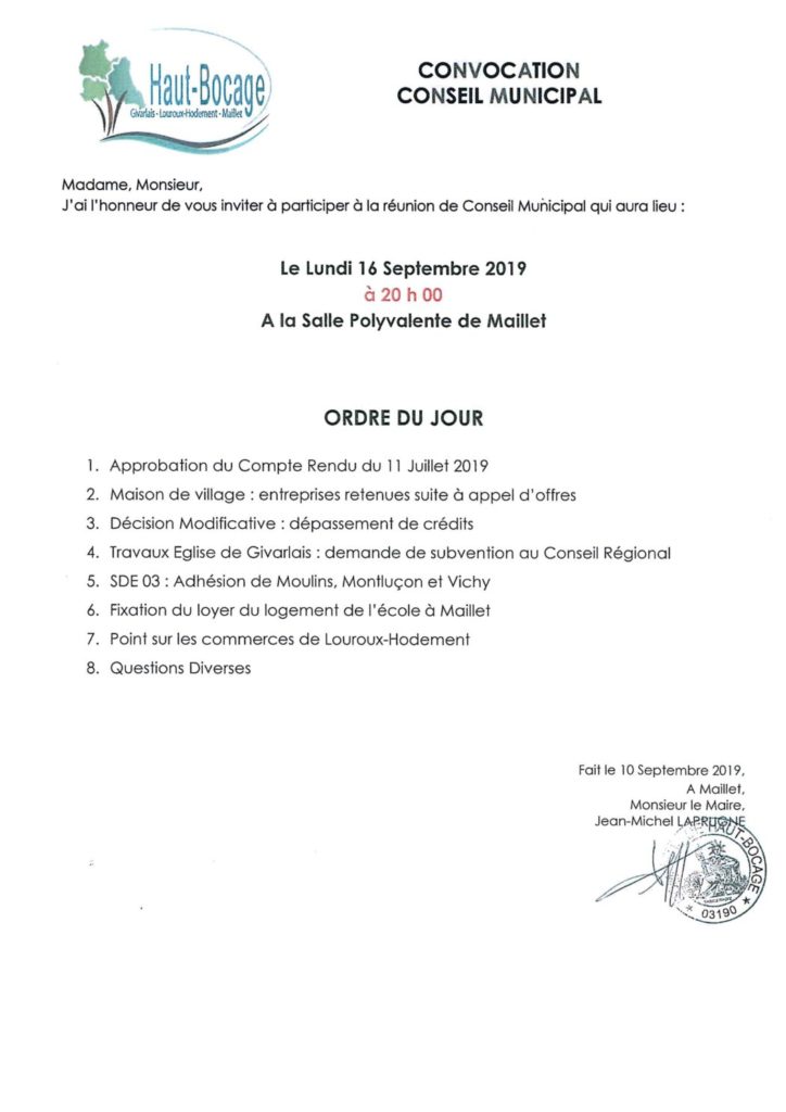 Une réunion de Conseil Municipal aura lieu le lundi 16 septembre 2019 à 20h à la salle polyvalente de Maillet