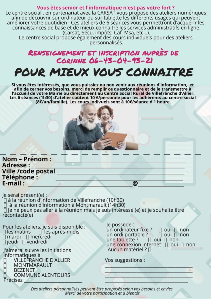 Le Centre Social Villefranche d’Allier-Montmarault a le plaisir de vous annoncer la tenue des réunions d’information concernant les ateliers seniors numériques :