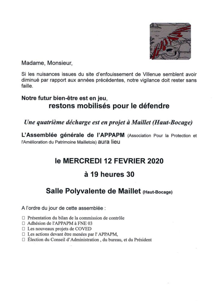 L’Assemblée générale de l’APPAPM aura lieu le mercredi 12 février 2020 à 19h30 à la salle polyvalente de Maillet.