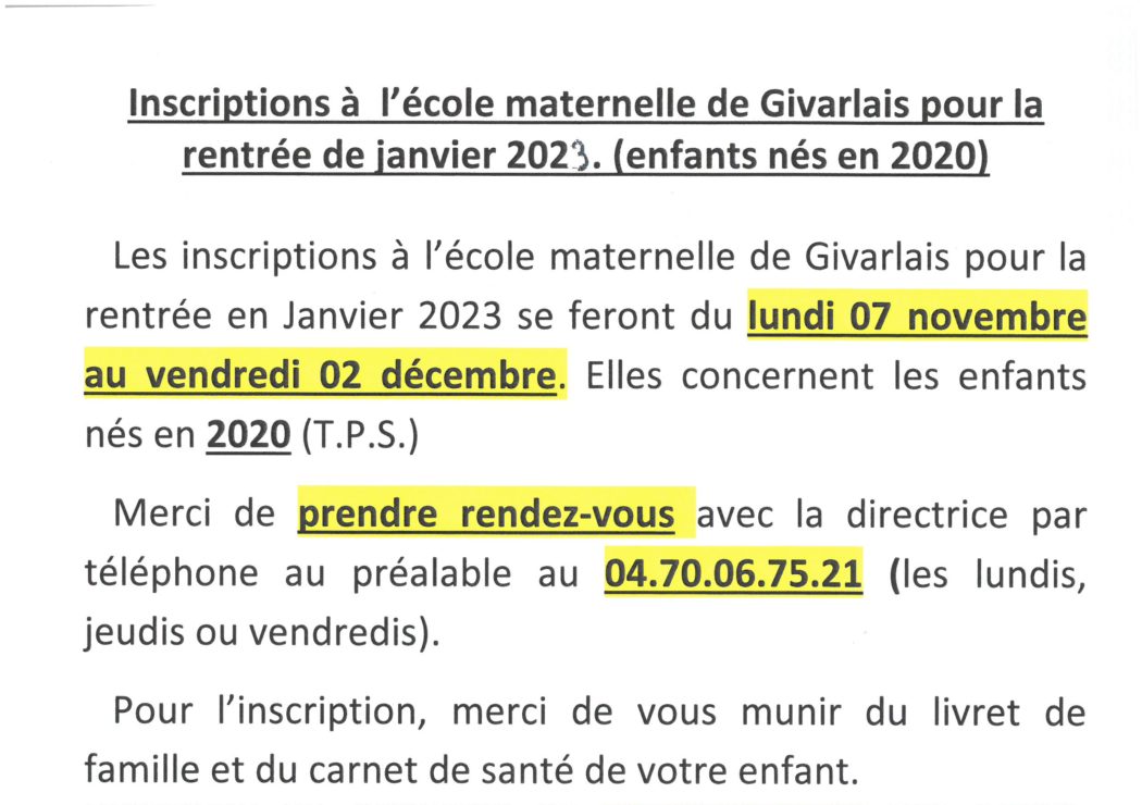 Inscriptions à l’école de Givarlais, rentrée janvier 2023