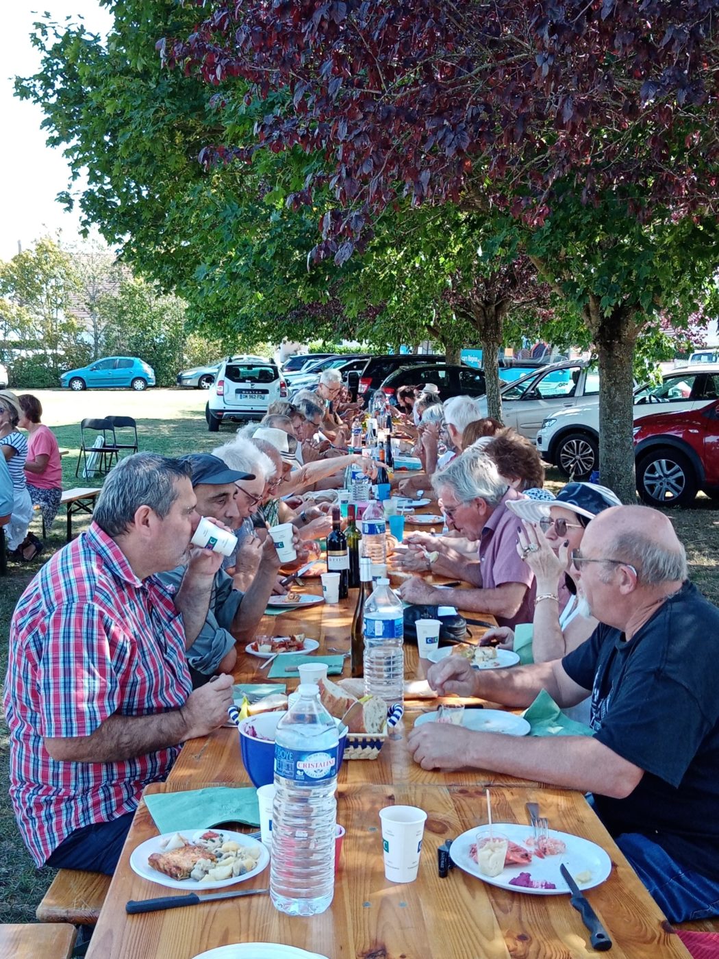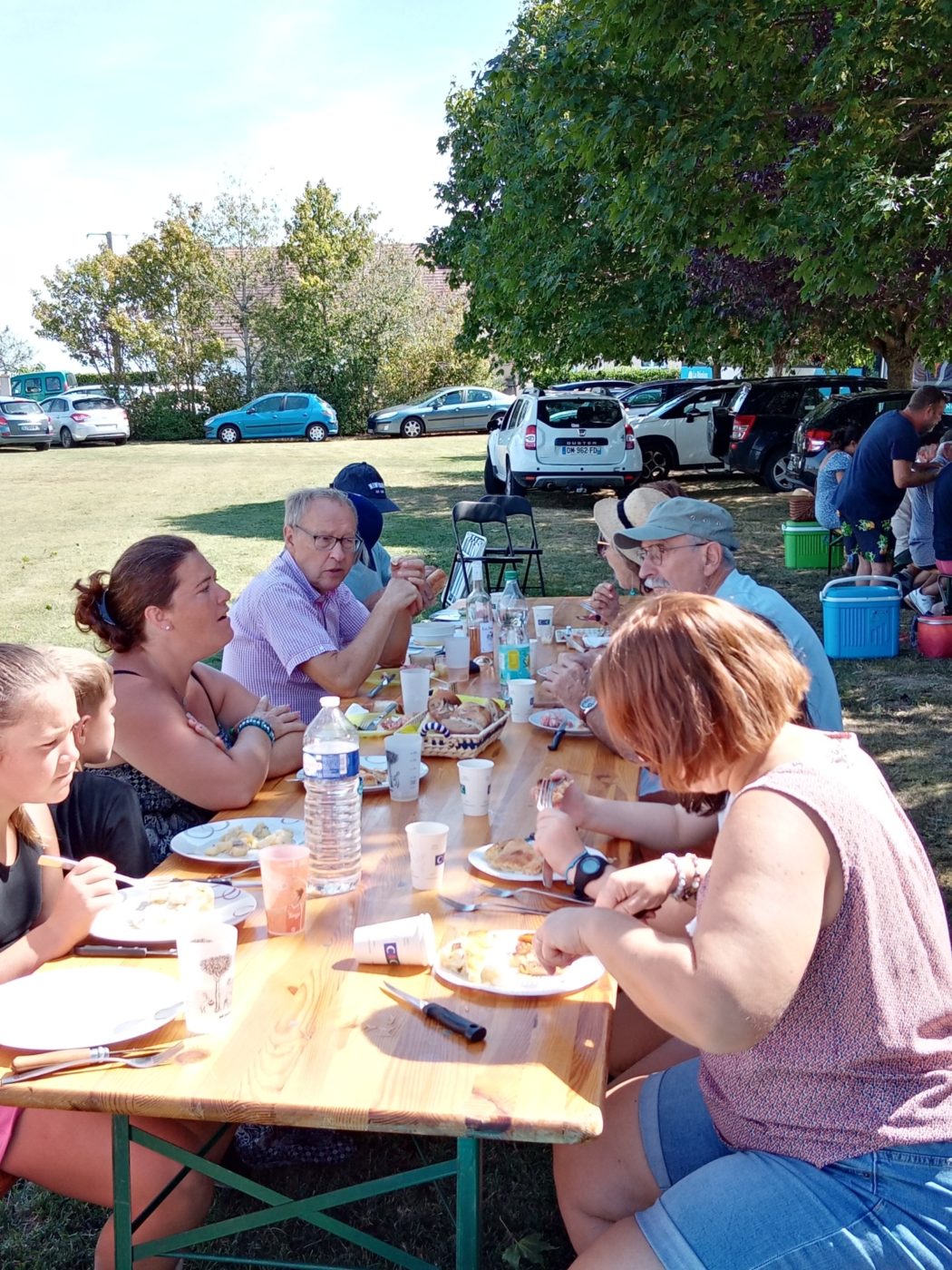 A l’initiative du Foyer rural de Givarlais, 70 personnes se sont réunies sur le terrain communal des Martourets à l’ombre des arbres afin de manger et boire ce que chacune et chacun avait préparé ou emmené dont le fameux aux patates entre autre…..