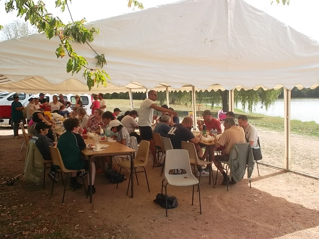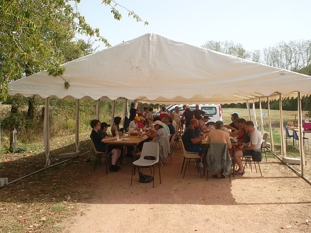 Et bien sûr, toutes et tous se sont regroupés sous le barnum prêté par la Commune et installé par la société de pêche pour l’heure du pique-nique.
