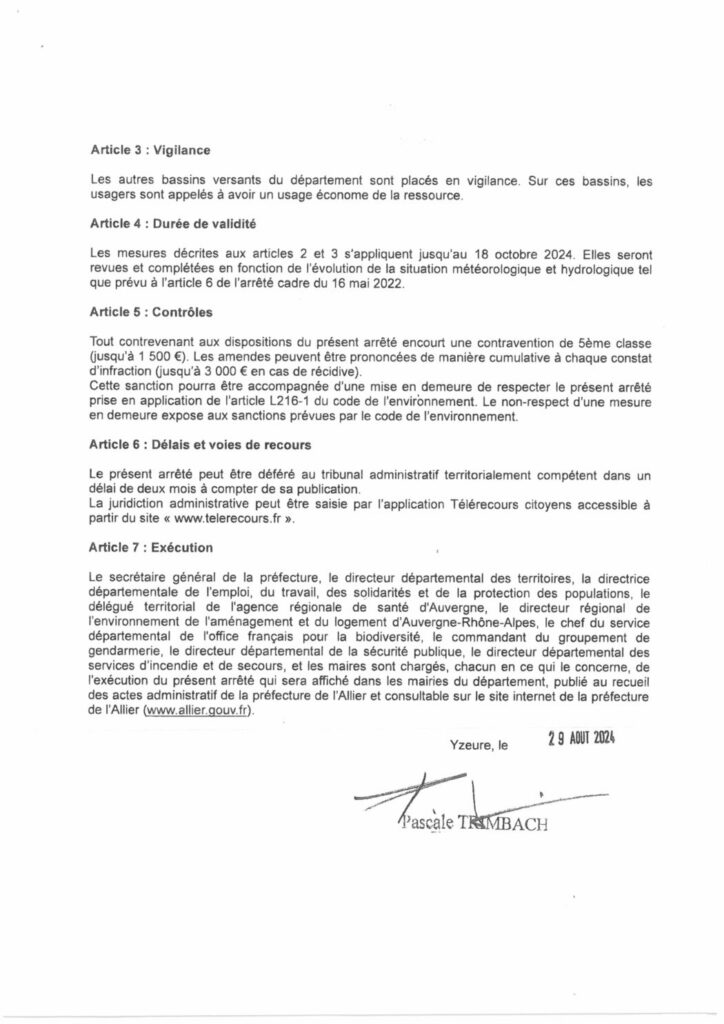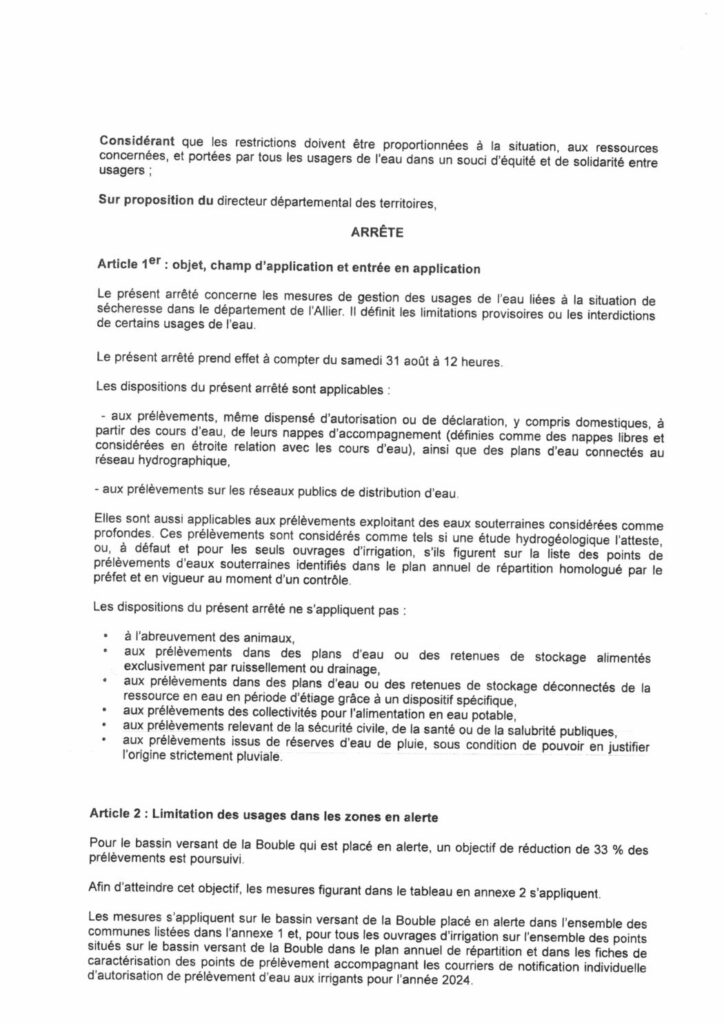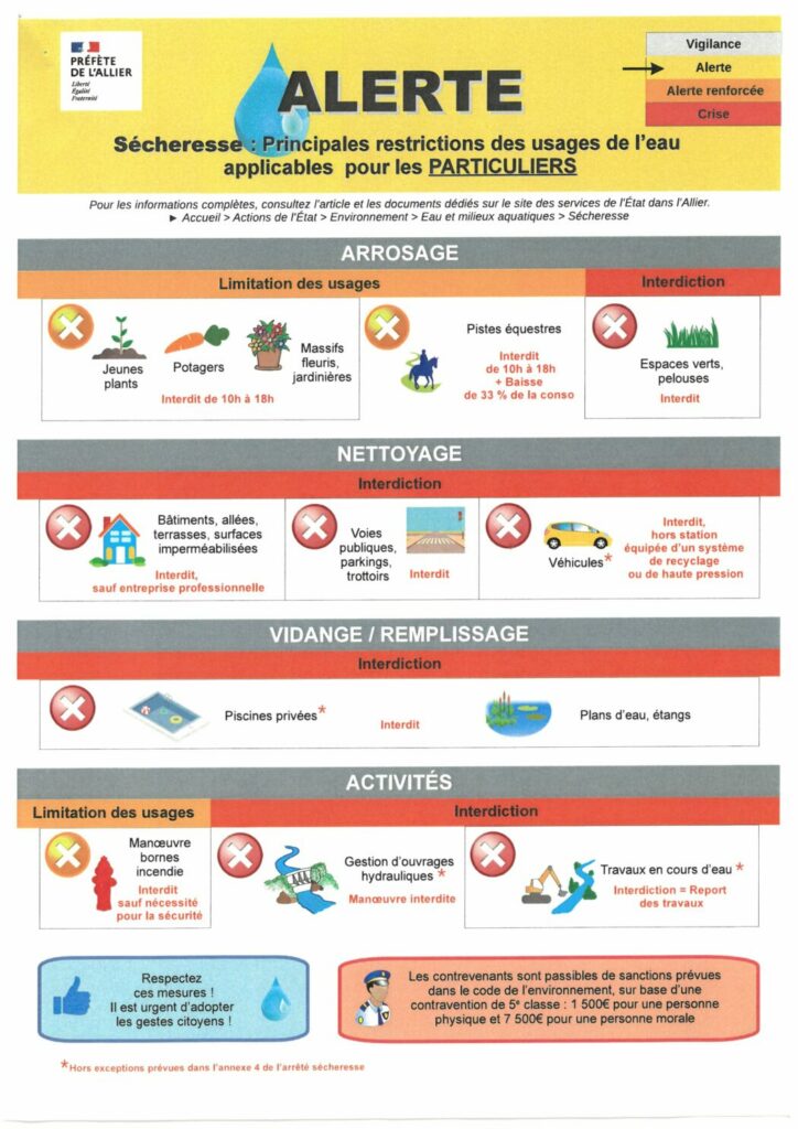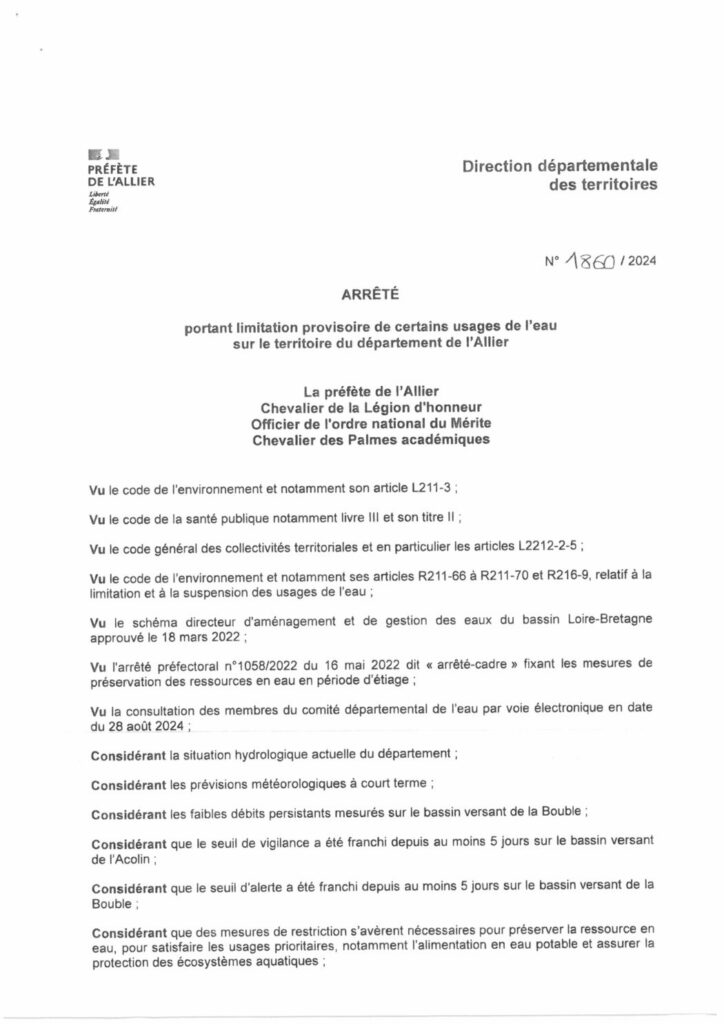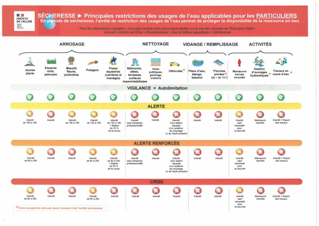 Arrêté portant limitation provisoire de certains usages de l’eau dans le département de l’Allier