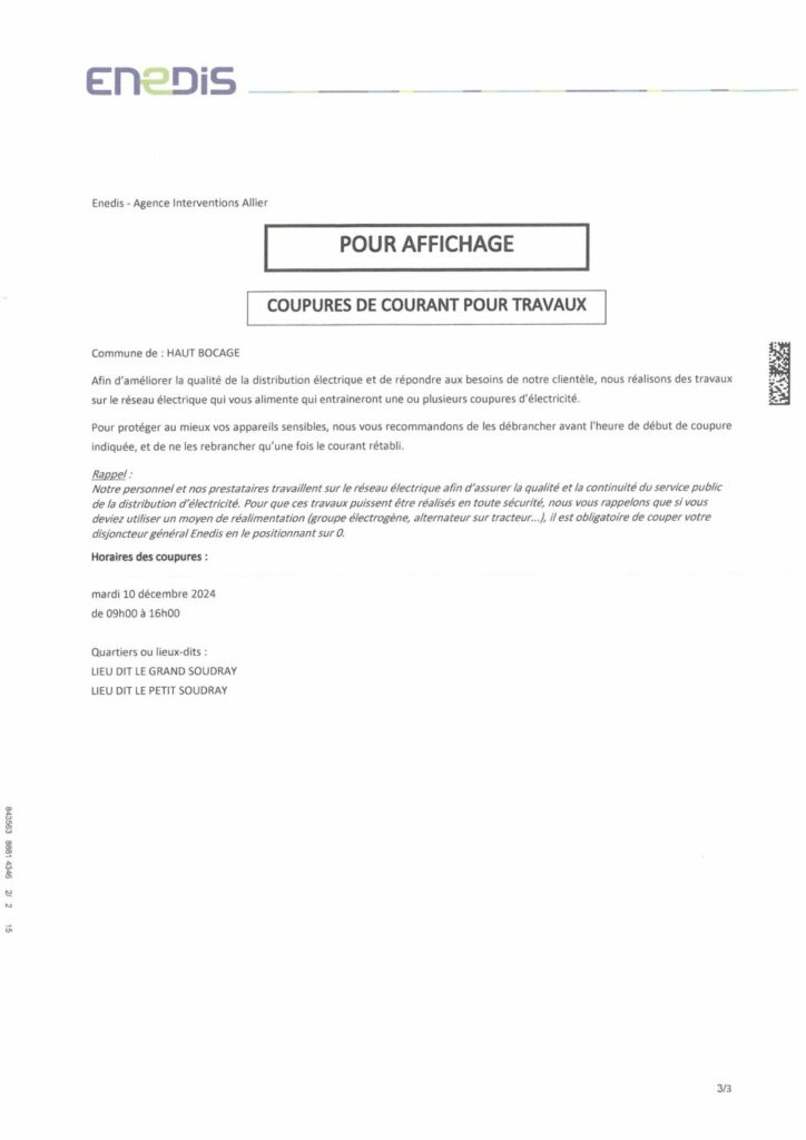 Coupures de courant pour travaux – lieux dits « Le Petit et le Grand Soudray » à Maillet