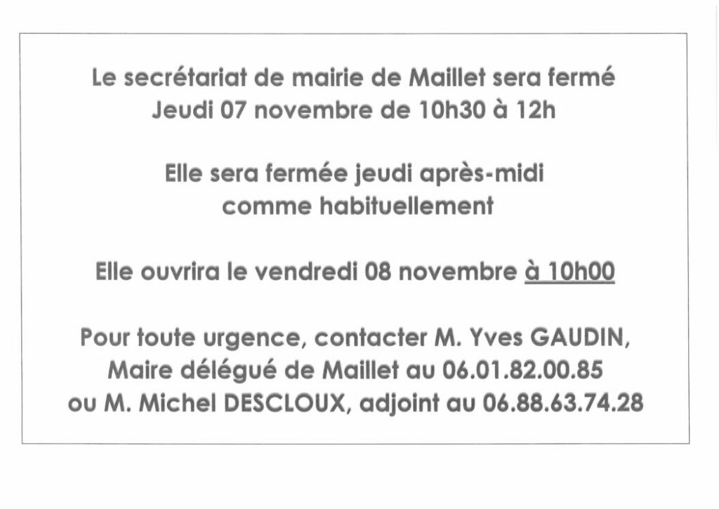 Fermeture mairie Maillet jeudi 07 novembre de 10h30 à 12h et vendredi 08 novembre de 08h à 10h00