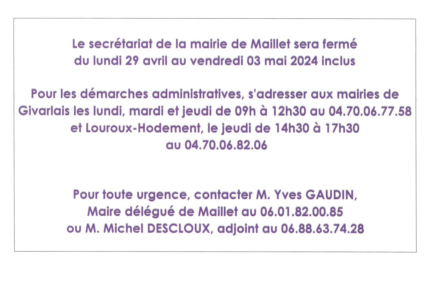 Fermeture secrétariat de mairie de Maillet