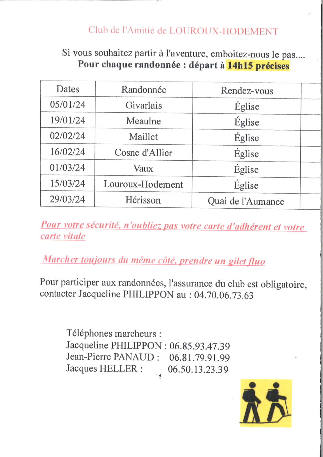 Planning 2024 des marches organisées par le Club de l’amitié de Louroux-Hodement