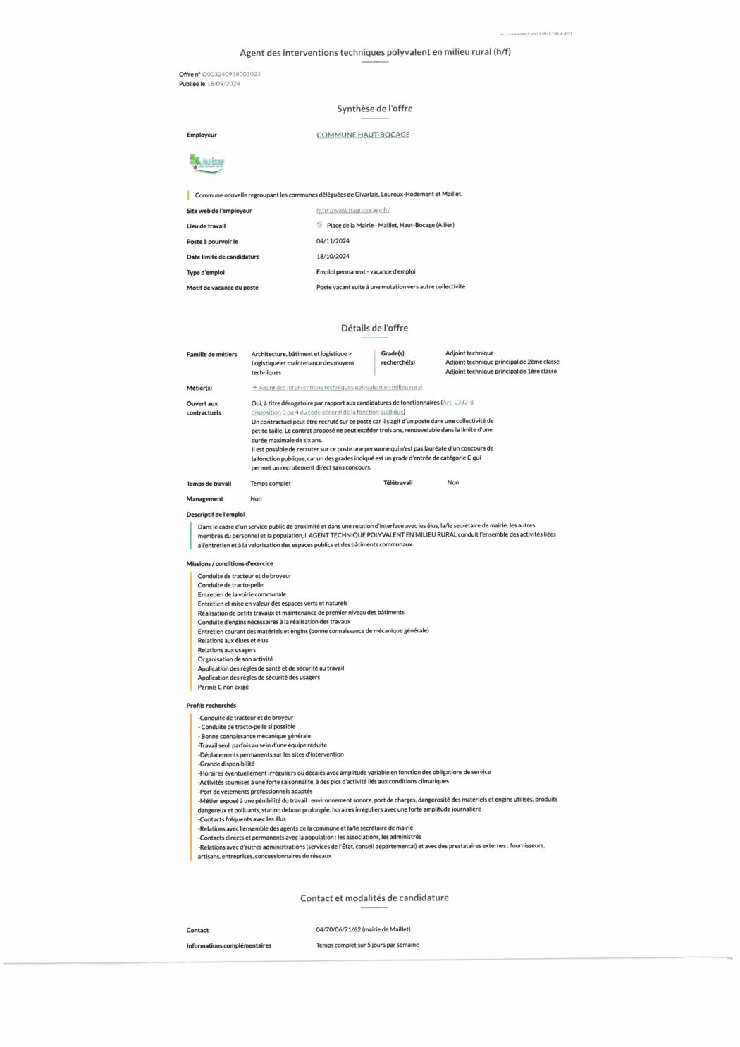 La commune de HAUT-BOCAGE recrute un agent technique pour la Commune déléguée de Maillet