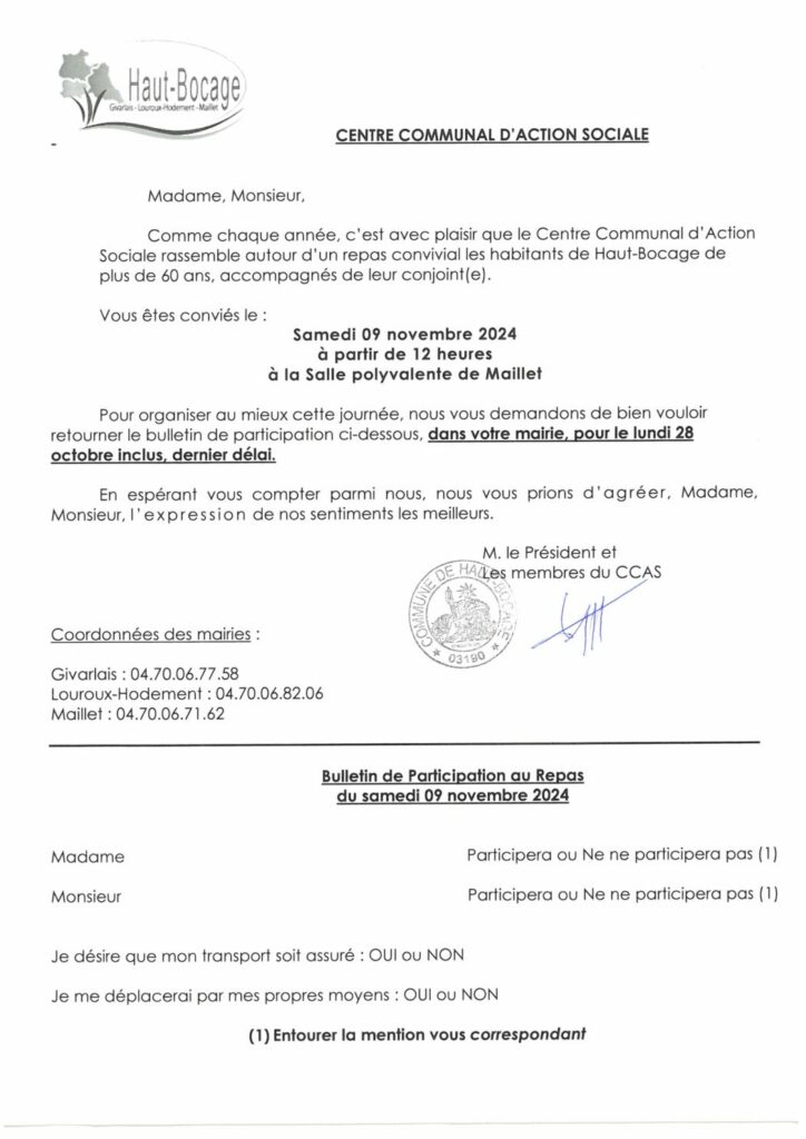 Mairie de Givarlais : 04.70.06.77.58 – Mairie de Louroux Hodement : 04.70.06.82.06 et Mairie de Maillet au 04.70.06.71.62.