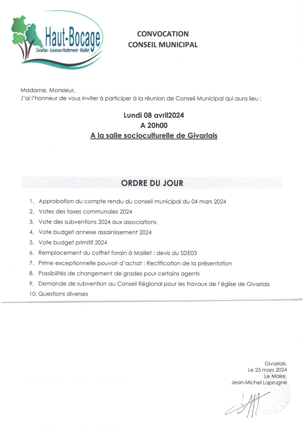 réunion de conseil municipal : 08 avril 2024