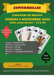 L’Amicale des donneurs de Sang Bénévoles d’Estivareilles organise son grand concours de belote le samedi 6 décembre à partir de 13h30 à la salle polyvalente d’Estivareilles