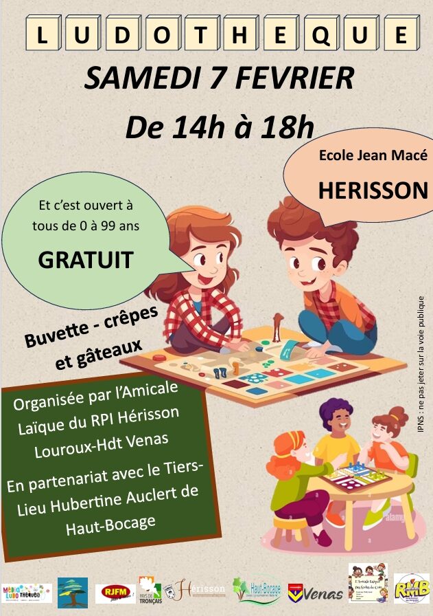 L’Amicale Laïque du RPI (Louroux-Hdt, Venas et Hérisson) et le Tiers Lieu Hubertine Auclert (Haut-Bocage), vous propose un après-midi Ludothèque, le SAMEDI 07 FEVRIER de 14h à 18h à l’école Jean Macé de Hérisson. Entrée GRATUITE.