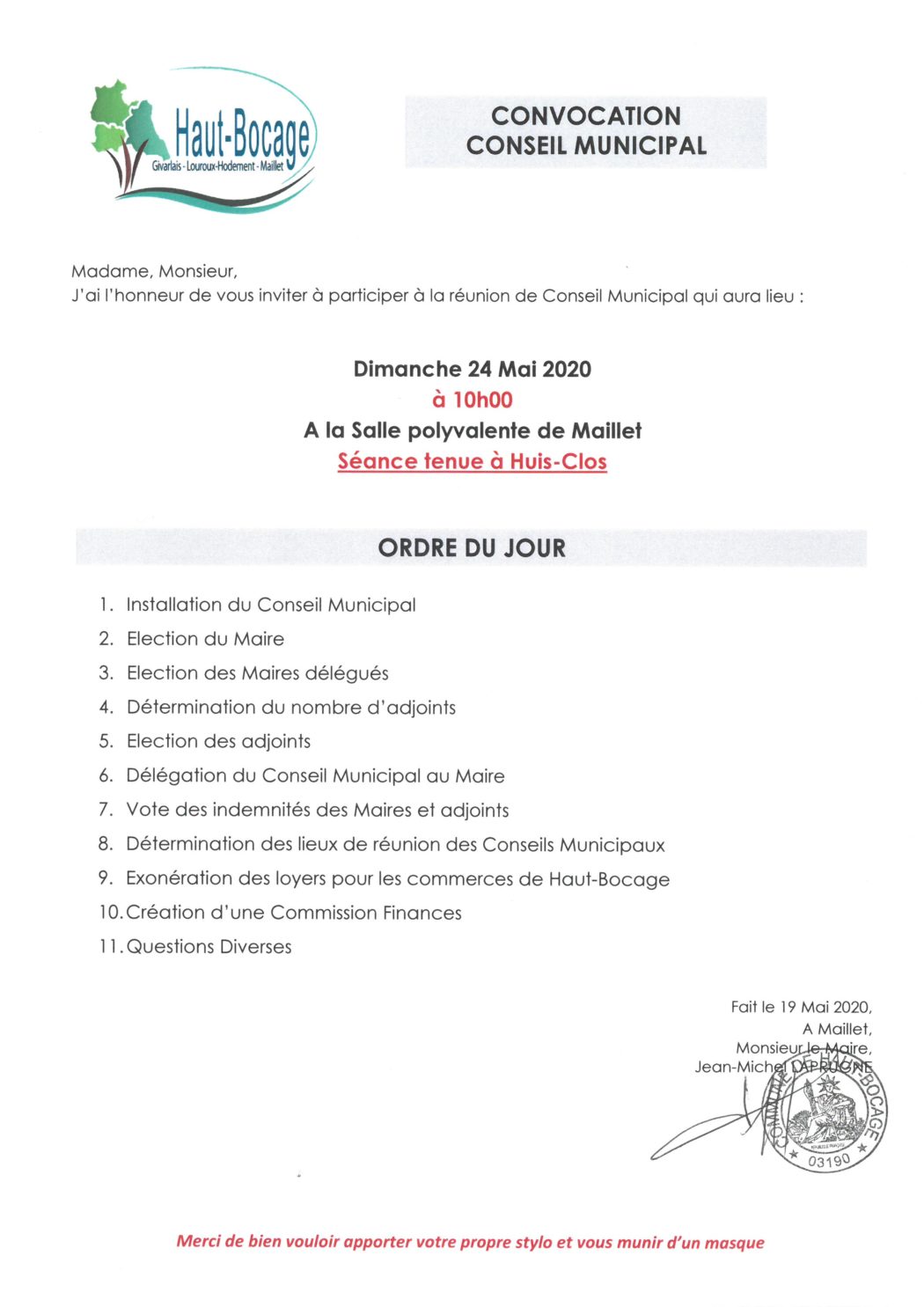 La séance de Conseil Municipal sera tenue à HUIS CLOS, dimanche 24 Mai 2020 à 10h00 à la salle polyvalente de Maillet
