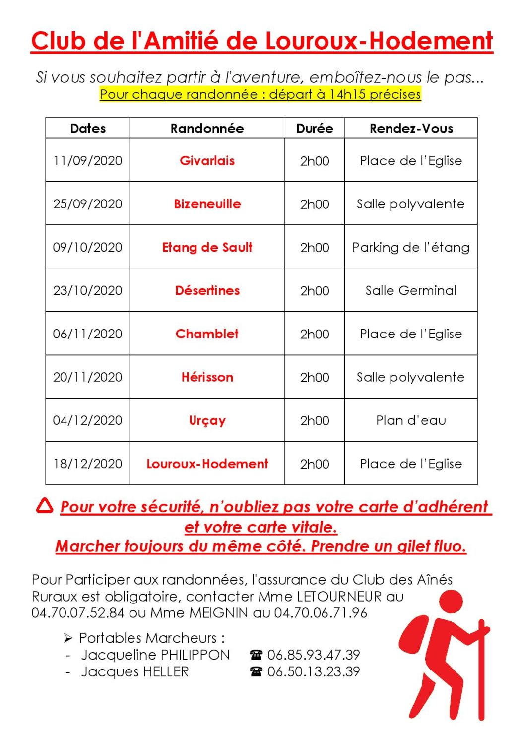 Pour Participer aux randonnées, l’assurance du Club des Aînés Ruraux est obligatoire (contacter Mme LETOURNEUR au 04.70.07.52.84 ou Mme MEIGNIN au 04.70.06.71.96)