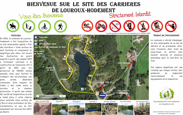 En 2006, la commune de Louroux-Hodement a fait l’acquisition de ce site remarquable appelé « Site des carrières », d’une surface de neuf hectares et comprenant un magnifique plan d’eau. Cet ancien lieu d’extraction de granit exploité à partir des années 1925 a fortement contribué à la construction de l’autoroute A71 à partir de 1983 avec une production annuelle de 100 000 tonnes. Ainsi, pour faciliter le transport des marchandises, une piste privée d’une longueur de 2,6 km, désormais communale, a été créée entre la carrière et le chantier autoroutier.